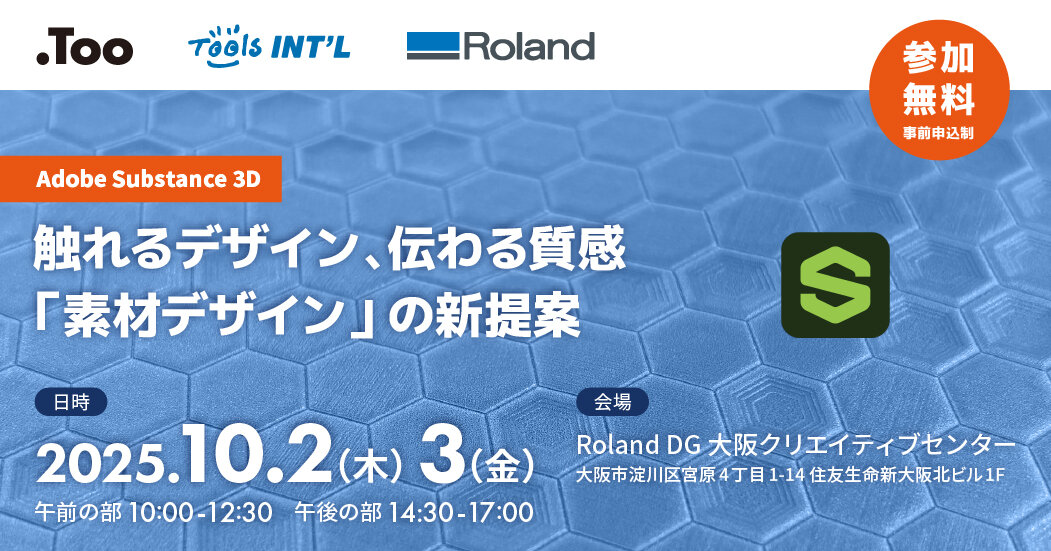 本セミナーではAdobe Substance 3Dを用いた、新しい「素材デザイン」の制作ワークフローをご提案いたします。Adobe Substance 3Dで効率的にパターンを作成し、Roland UVプリンターで高品質なサンプルを出力します。具体的なデータの作成方法の解説と、UVプリンターの活用をお客様の実際の目でご覧いただきます。