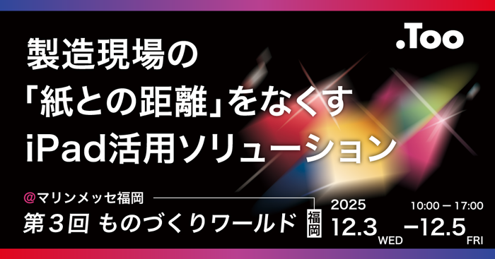 株式会社Tooは、2025年12月3日(水)- 5日(金)、マリンメッセ福岡で開催される「第3回 ものづくりワールド 福岡」の「製造業DX展」に出展します。