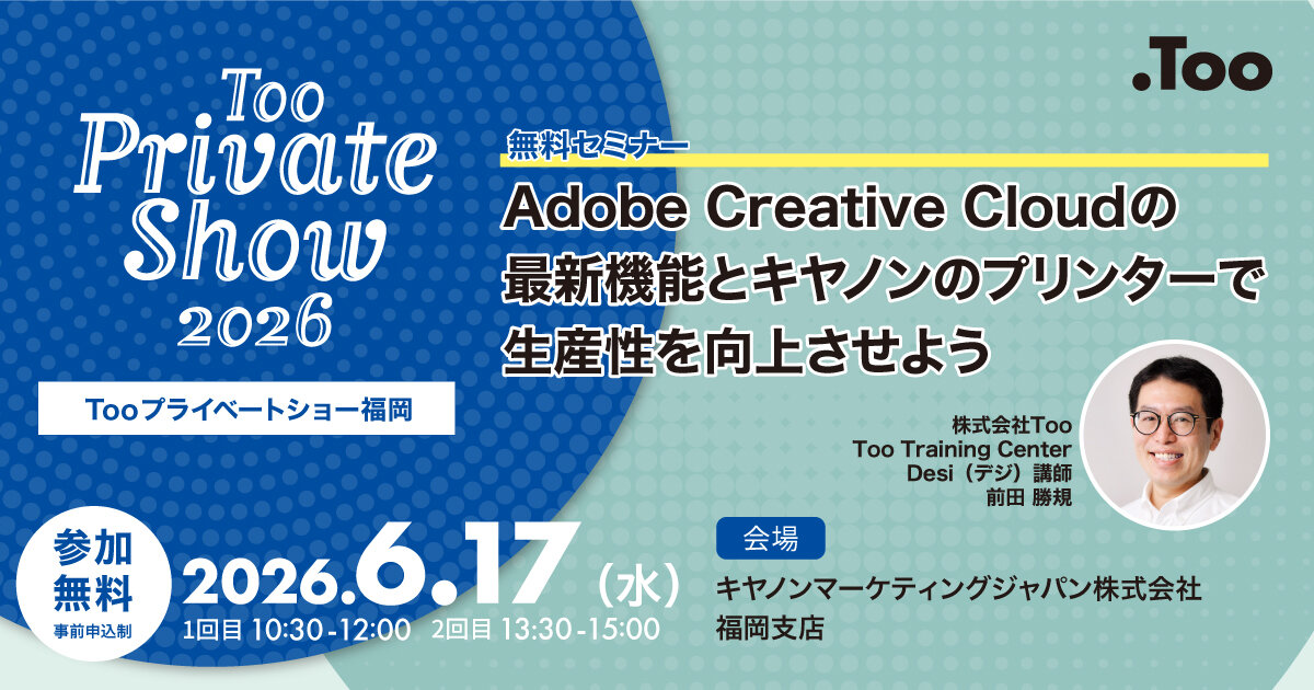 さらに、Too Training Center Desi(デジ)講師の前田より、Adobe Creative Cloudの魅力を深掘りする無料セミナーも同時開催します。