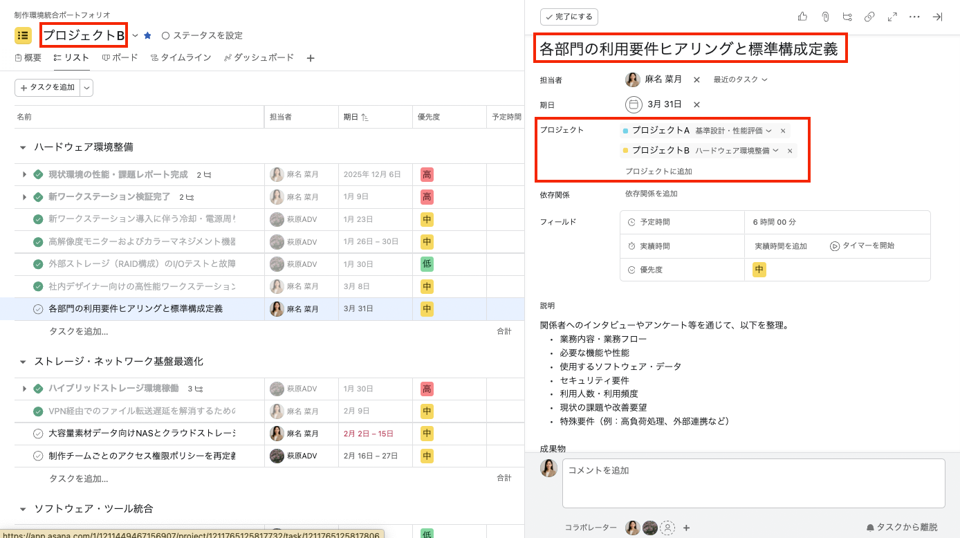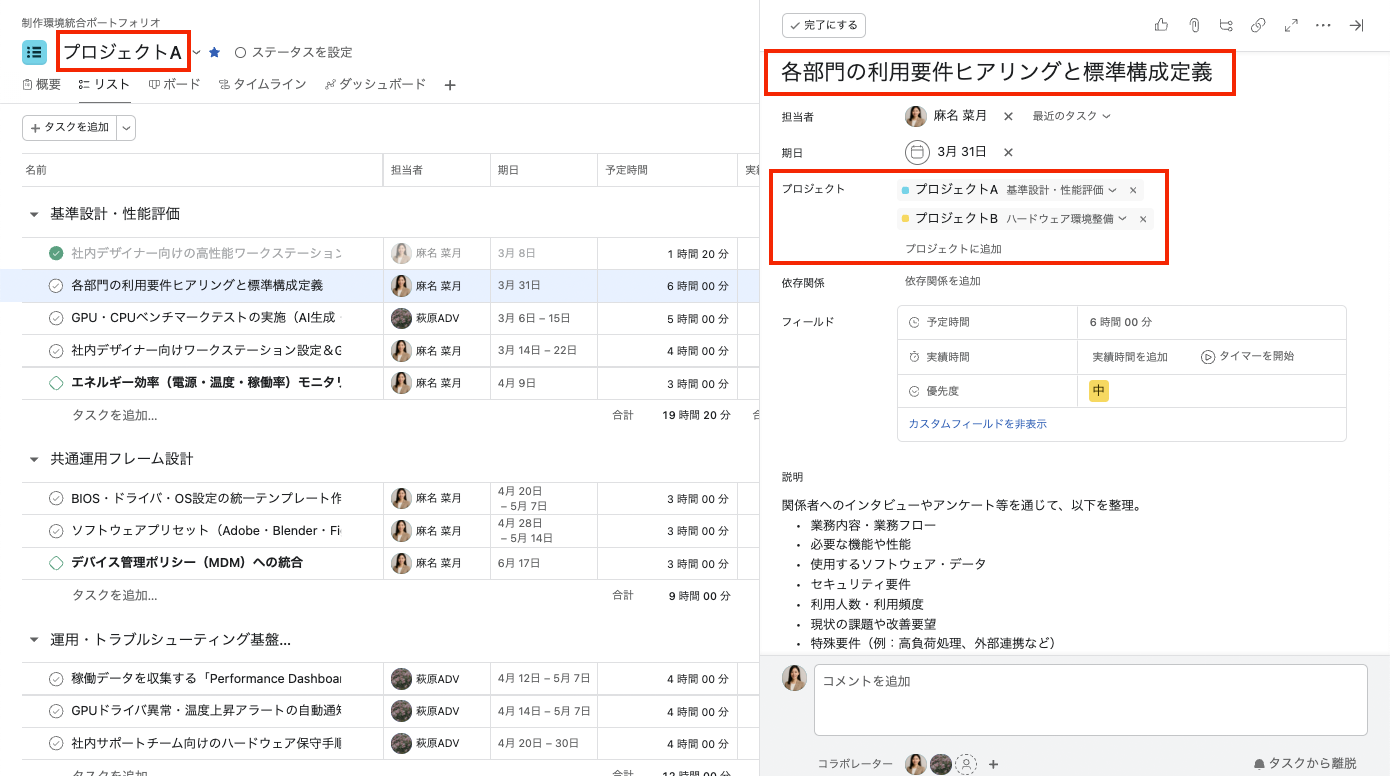 「各部門の利用要件ヒアリングと標準構成定義」という同一のタスクが、双方のプロジェクトに表示されています。