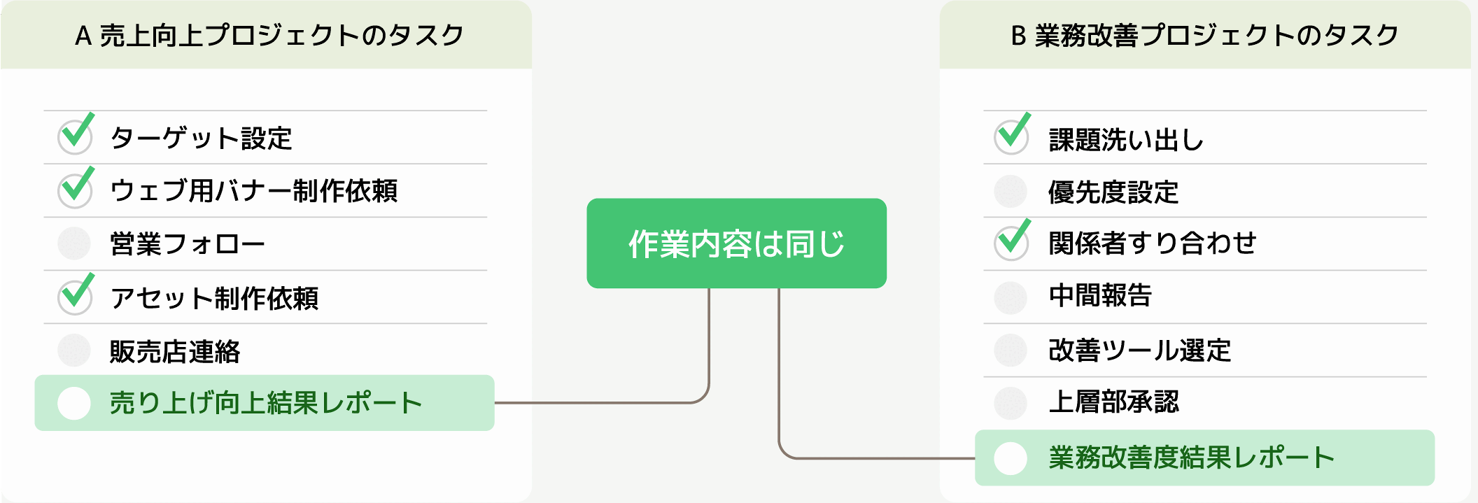 例:同じ分析作業だが、Aプロジェクトでは売上向上目的でおこない、Bプロジェクトでは業務改善目的でおこなう。