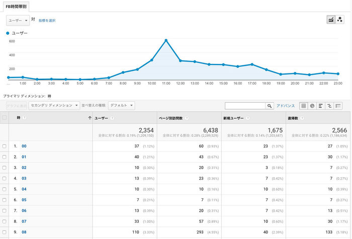 Google Analyticsは集客や行動では一部を除き、表形式で解析結果が表示されます。