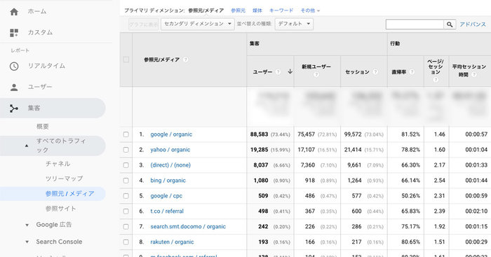 レポート > 集客 > ▼すべてのトラフィック > 参照元/メディア