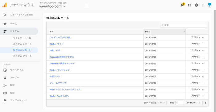 レポートは、表示を日付などで絞り込むことができます。絞り込まれた状態は一時的なものなので、いつでもアクセスしやすいように、「保存済みレポート」として保存することができます。保存されたレポートはこのカスタムからアクセス可能です。