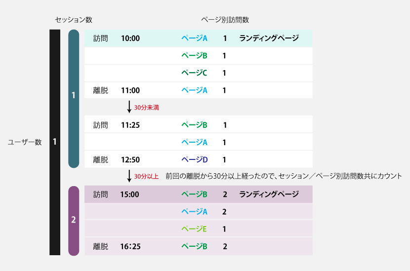 - ページごとに見た人の数です。ページビューと異なり、同じ人が何回見ても1回とカウントされます。よりユーザー数に近い数字ですが、最後にページを開いてから30分以上の間隔があくと、新規訪問としてカウントされます。