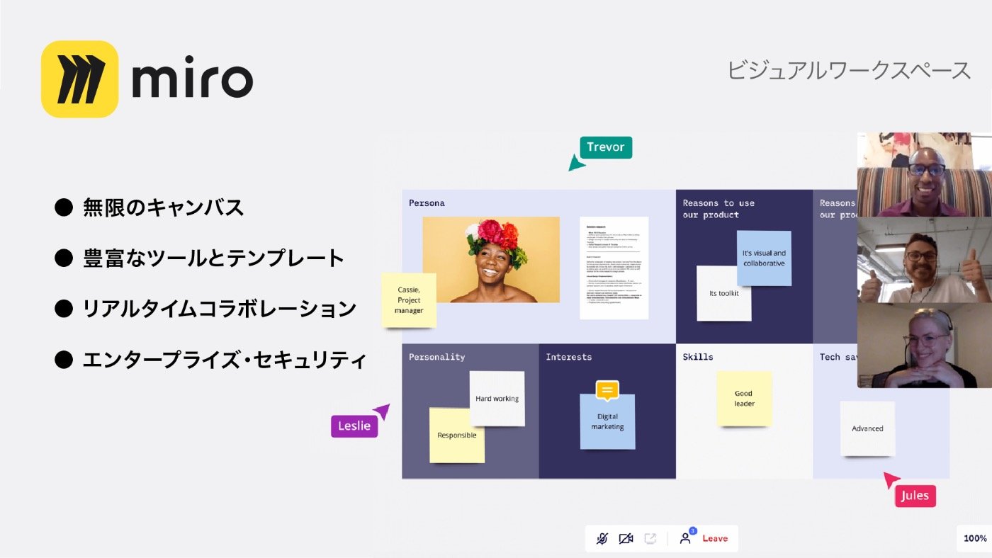 アイデアから成果までのプロセスを加速するAI搭載の統合型コラボレーションプラットフォームです。はやく、わかりやすく、リアルタイムでメンバー間の情報共有・コミュニケーションを活性化します。アイデアの創出から実行までを、ひとつのキャンバス上でつなぐことができるのがMiroです。クリエイティビティを最大限に発揮しながら、課題解決など生産性の高い業務を遂行できます。