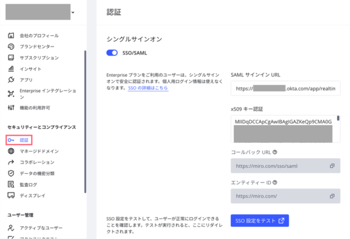 EnterpriseプランではSSOや2FA(2要素認証)などで、Miroへのアクセスを制御できます。また、SCIMにも対応しますので、ID プロバイダー(IdP)を通じて、ユーザー管理が実施できます。