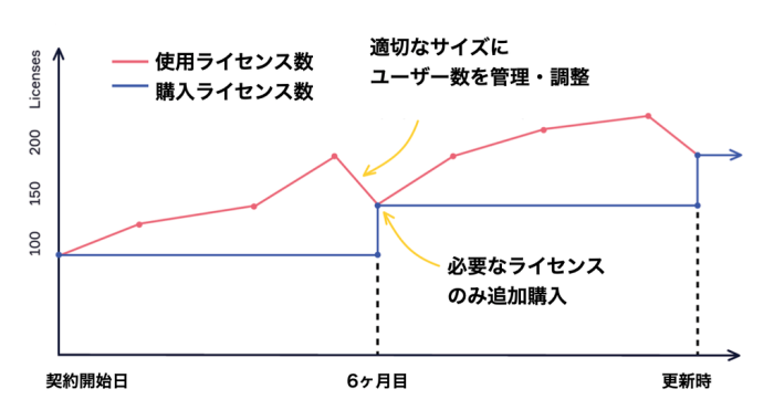 例えば、導入時に100ライセンス導入の場合、契約後半年の間は100ライセンスを超えてメンバーを増やしても追加の請求はありません。