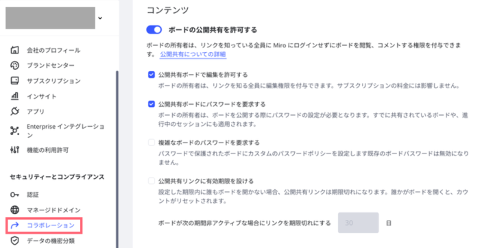 上記の3つの方法から、「公開リンクを発行させない」など、ボードの最大公開範囲を制御できます。 また、公開リンクに関しては発行の可否だけでなく、パスワードや有効期限の強制も可能です。