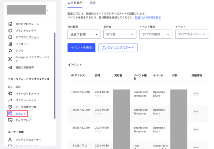 Miroの監査ログはEnterpriseプランの利用開始時から保存が開始されます。アカウント管理やユーザー管理、ボードに対するアクションなどログとして取得できるイベントはさまざまあります。