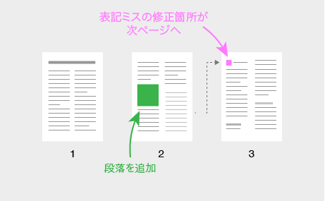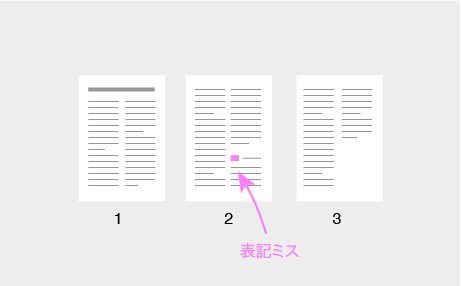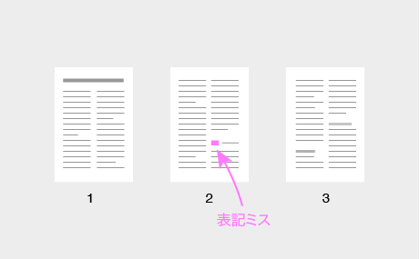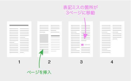1つの修正箇所を確認するだけでも、影響するすべてのページをチェックし直す必要があり、修正箇所や回数が増えるたび確認範囲や校正作業にかかる時間も雪だるま式に増えていきます。