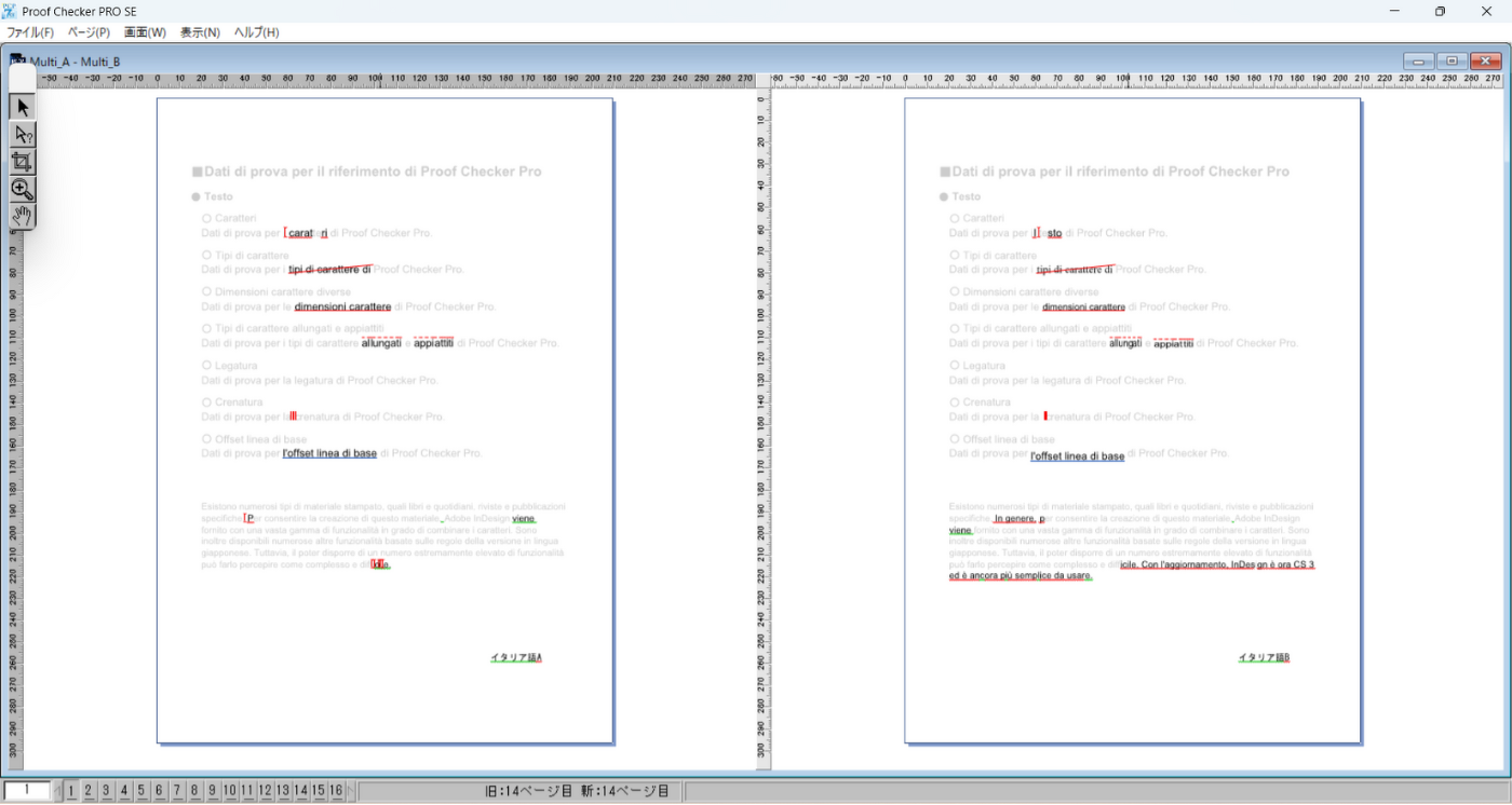 Proof Checker PROは、よくある「画像を重ねて比較する画像比較」とは異なります。PDFの内部情報をもとに差分をチェックするため、画像比較のように一行の挿入だけでその後すべてが差分として表示されてしまうことはありません。