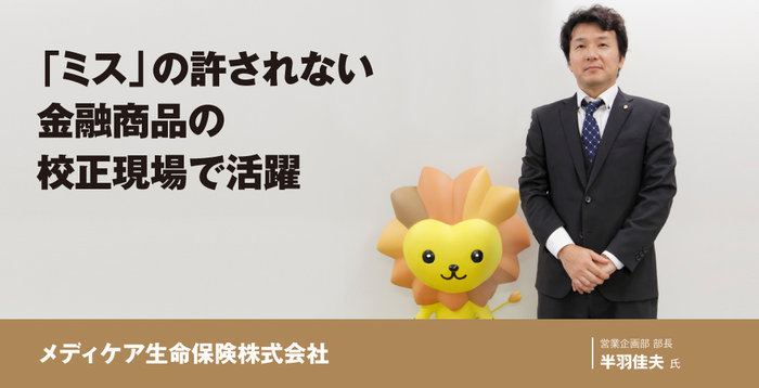 メディケア生命保険株式会社様は、お客様の視点に立った保険商品の提供を目指し、わかりやすさと選びやすさを重視した商品パンフレットや広告の制作にも力を入れています。その保険商品の広告などの校正作業にProof Checker PROが活用されています。導入のきっかけやその利用方法について、営業企画部副長の半羽佳夫様にお話をうかがいました。