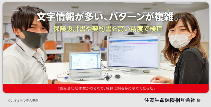 住友生命保険相互会社様の代理店事業管理部代理店業務サポート室では、保障内容や保険料が記されている保険設計書の文字校正に、ドキュメント差分検出ソフトウェア「Collate Pro」を導入されました。「画像ベースの比較ツールでは限界を感じていた」と語る川上様、平野様、村瀬様に導入された経緯や効果についてお話をうかがいました。