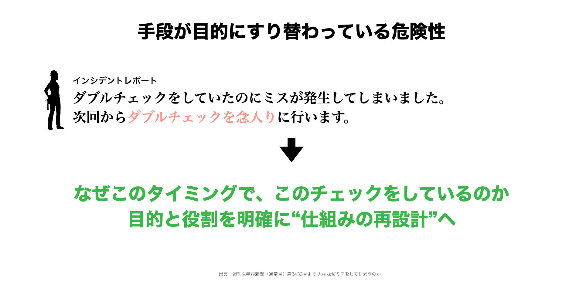 また、日常的におこなわれているダブルチェック・トリプルチェックは手段が目的にすり替わっていることもあります。