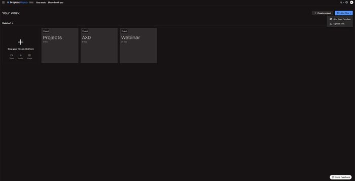 Dropbox Replayの画面右上にある「Add files」で「Add from Dropbox」を選択すると、Dropboxに既にアップしているファイルをDropbox Replayに読み込むことができます。