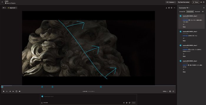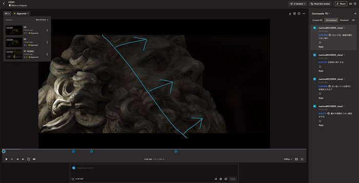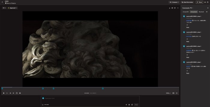 複数バージョンが存在する際に、バージョンを切り替えるとそれぞれのファイルの同じフレームを表示するので、バージョン間の比較にも使えます。また、Live reviewという機能があり、参加している人全員で同じタイミングで動画を再生して確認することもできます。