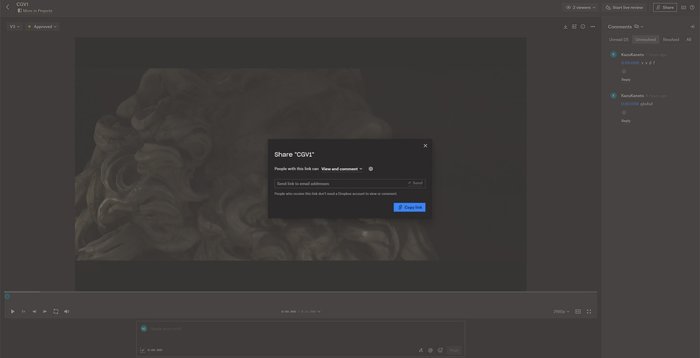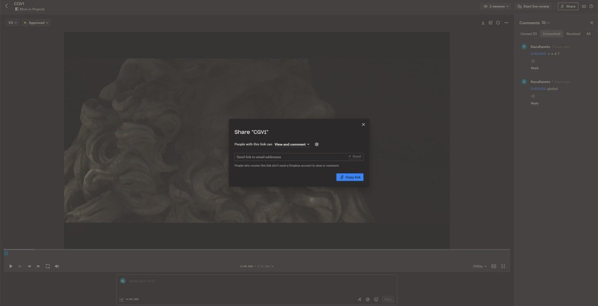 関係者などに試写に参加してもらう場合は、画面右上にある「Share」をクリックして現れた画面の「Copy link」をクリックします。現在フィードバックをおこなっているDropbox Replay画面のURLを取得できるので、URLを受け取った人は同じ画面でフィードバックを共有することができます。その場合はDropboxのIDは必要ありません。