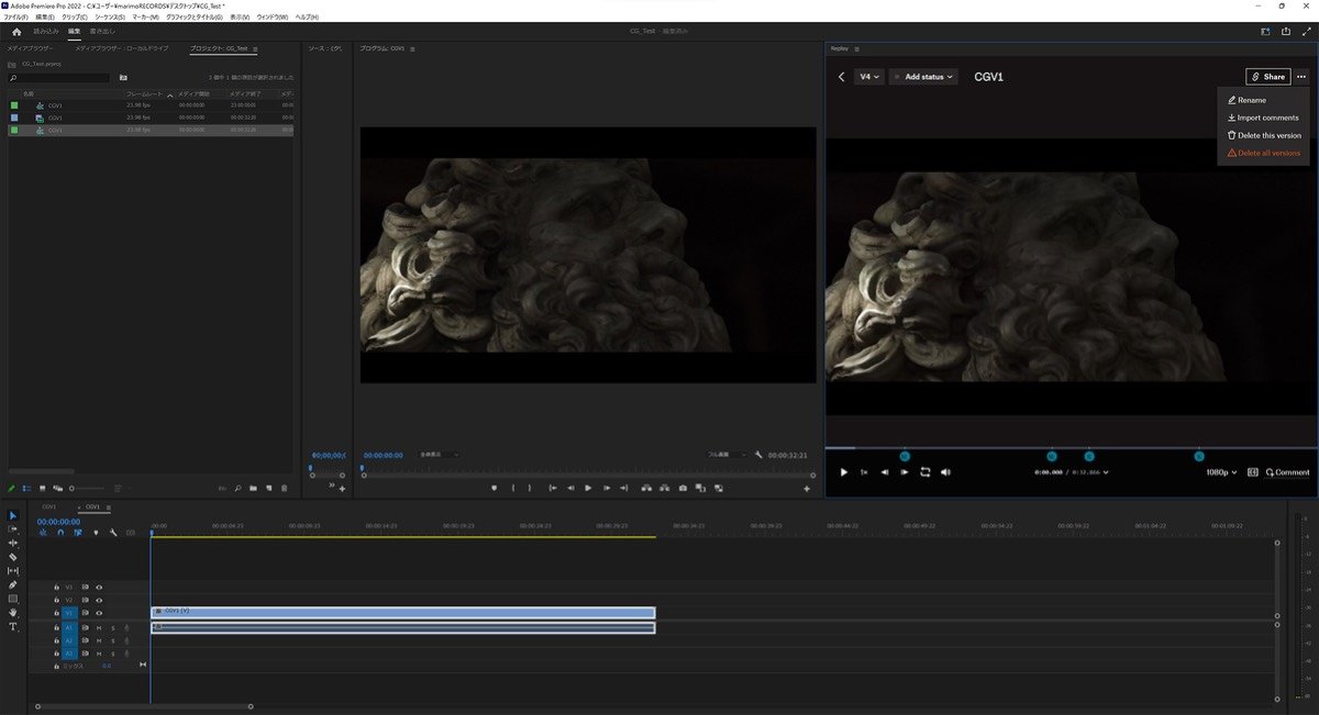 また、Dropbox Replayで追加されたコメントは、Premiere Pro内のDropbox Replay画面右上のメニューから「Import comments」を選択すると、コメントがタイムライン マーカーとしてシークエンスに追加されます。