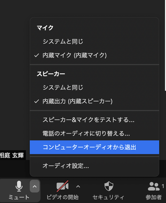 Zoomでは、ビデオ会議画面左下のマイクアイコンの隣にあるボタンから「コンピューターオーディオから退出」を選択することで、各自の端末のオーディオを使わずにビデオ会議に参加することができます。