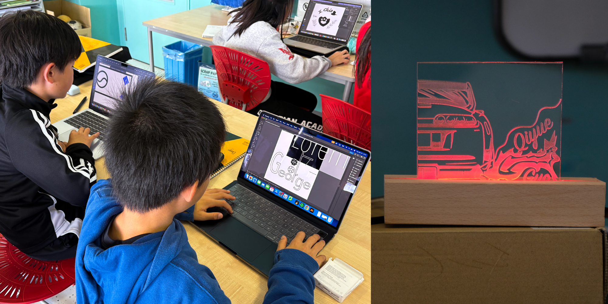 中学校・高校を担当するJan(以下、ヤン)先生は、高校1、2年生のグラフィックデザインの授業で、レーザーカッターを使ったものづくりをおこなっているとのこと。Illustratorでデザインしたオリジナルモチーフを、レーザーカッターでアクリル素材に刻み、LEDライトスタンドの彫刻を作り上げます。デジタルツールだけでは完結しないものづくり体験が実施されています。