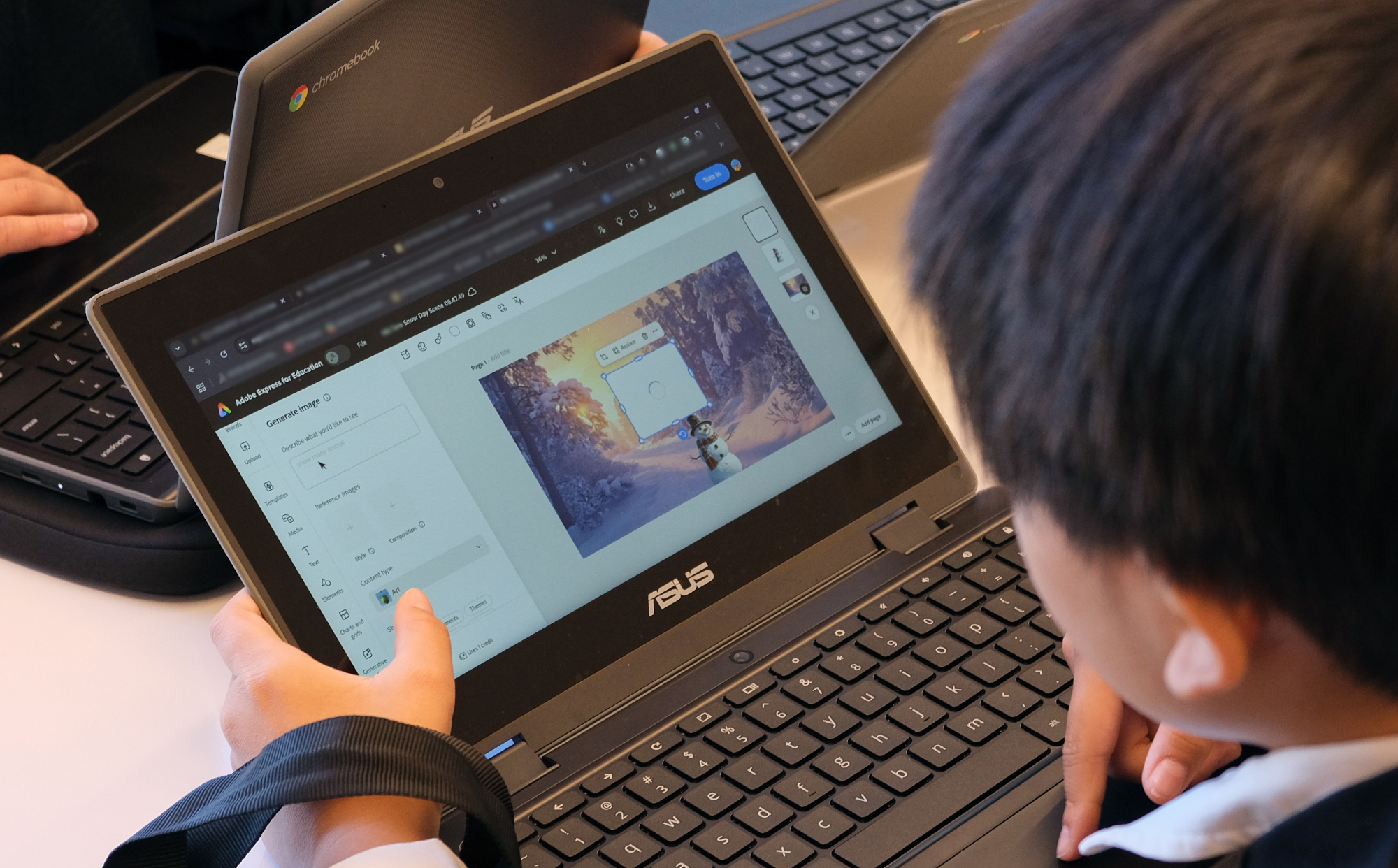 例えば、3〜4年生のVisual Artsの授業では、出身地の異なる子供たちが自分の思い描く雪景色を、Adobe Express内のAIで生成した背景やオブジェクトを重ね、遠近法を学びながら表現しています。中にはアニメーションをつけて雪を降らせた作品も。それぞれのバックグラウンドがよく現れた作品が数多く生まれています。