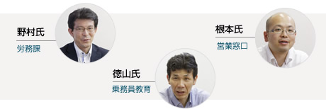 私は普段は労務課といって労働組合の窓口をやっています。根本は営業などの問い合わせ窓口を中心に、徳山は総合研修センターで乗務員教育といった仕事を中心にやっています。