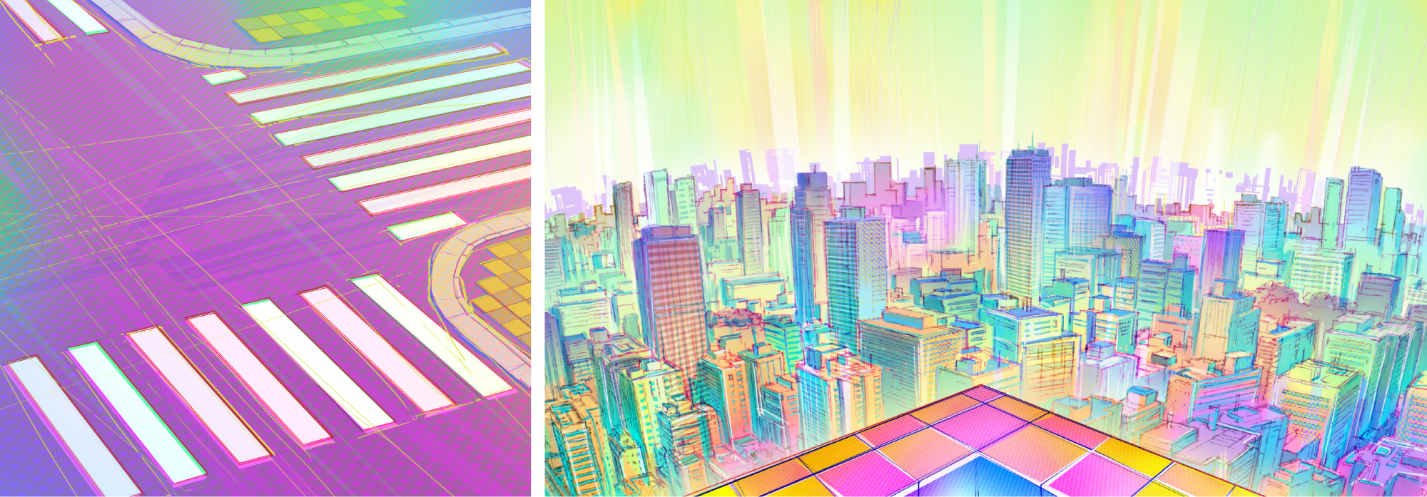 ベースの手法としては、ラインセットや検出方法、ストロークやディストーションの設定を少しずつ変えながら、レイヤーを複製してラインを重ねていく、というものです。合成方法もレイヤーごとに変更できるので、3ds Maxから出力する素材を増やすことなく、多彩な表現をコンポジション内で模索することができました。そこから発展して、塗り要素やパーティクル素材をラインで作成したりもしています。ライン表現の引き出しが手の届きやすいところに近づいたことで、今まではできなかった発想につながりました。