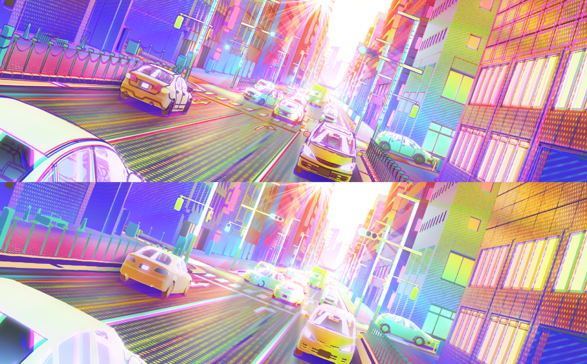 美術ボードを見た時、色ごとに印刷位置がずれているような「版ズレ」の表現と、ぶれや揺らぎのあるラフなラインを、3DCGの中でどう表現していくかがポイントだと感じました。その中でラフなラインを実現するためには、ストローク設定の異なるラインをいくつも重ねたり、奥行きに応じてディストーションを入れたりする必要があり、これらを普段使っている3ds Max版のPencil+ 4 Lineだけでおこなうのは現実的ではなかったので、体験版でテストをしてみたりしつつ、Pencil+ 4 Line for After Effectsの導入をお願いしました。
