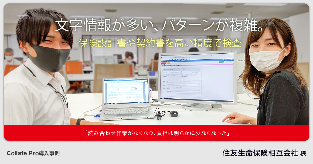 住友生命保険相互会社様は、保険事業を通じて「社会公共の福祉に貢献する」ことを掲げ、お客さまや社会にとって 「なくてはならない」保険会社を目指されています。代理店事業管理部代理店業務サポート室では、保障内容や保険料が記されている保険設計書の文字校正に、ドキュメント差分検出ソフトウェア「Collate Pro」を導入されました。導入された経緯や効果について、川上様、平野様、村瀬様にお話を伺いました。