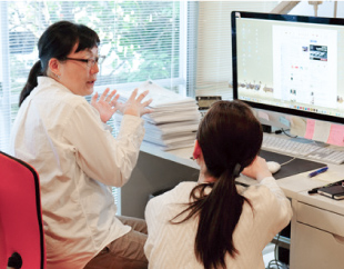 毎朝仕事の予定を共有し、リアルでのコミュニケーションも活発。少人数で効果的に仕事をするため、連携を大切にされています。