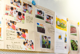 写真 + コメントによる、ドキュメンテーション。保育室だけではなく、廊下、階段の踊り場など、園内の至る所に掲示されている。保護者は送迎時に確認されているそう。
