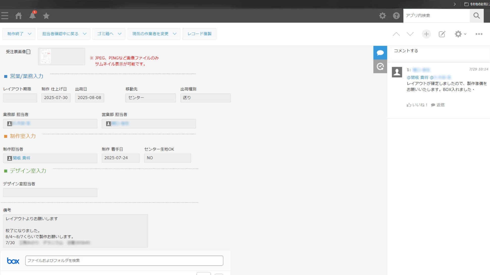 さらに、キントーンとBoxを連携することで、製作データにアクセスしやすくなりました。今までは、デザイン指示書は紙、お客様からいただいたロゴや素材一覧表はメールなど、データが点在していました。現在は、キントーンに案件を登録すると、案件ごとのフォルダがBoxに自動作成され、キントーンのフォームから、Boxにデータをアップロード・ダウンロードできます。あちこち探す必要がなくなり、デザインや製作に取り掛かるまでの煩雑な作業が体感で3分の1ほど削減されました。