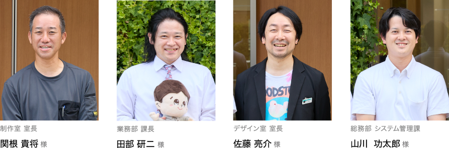 導入の経緯や効果を、制作室 室長 関根貴将様、業務部 課長 田部研二様、デザイン室 室長 佐藤亮介様、総務部 システム管理課 山川功太郎様に伺いました。
