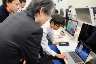 公開授業のはじまる1時間前、授業を終えた生徒たちがiMacの並ぶコンピュータ教室に集まってきました。生徒たちは成果発表前にできる限り制作アプリの改良を進めるべく、慣れた様子でXcodeを操作し、エラーが生じるたびに原因を考え、検証するという工程を積み重ねていました。 分厚いプログラミング言語の教本を活用し、担当講師らから助言をもらいつつ、生徒同士で相談しながらアプリ制作を進める様子が見られました。