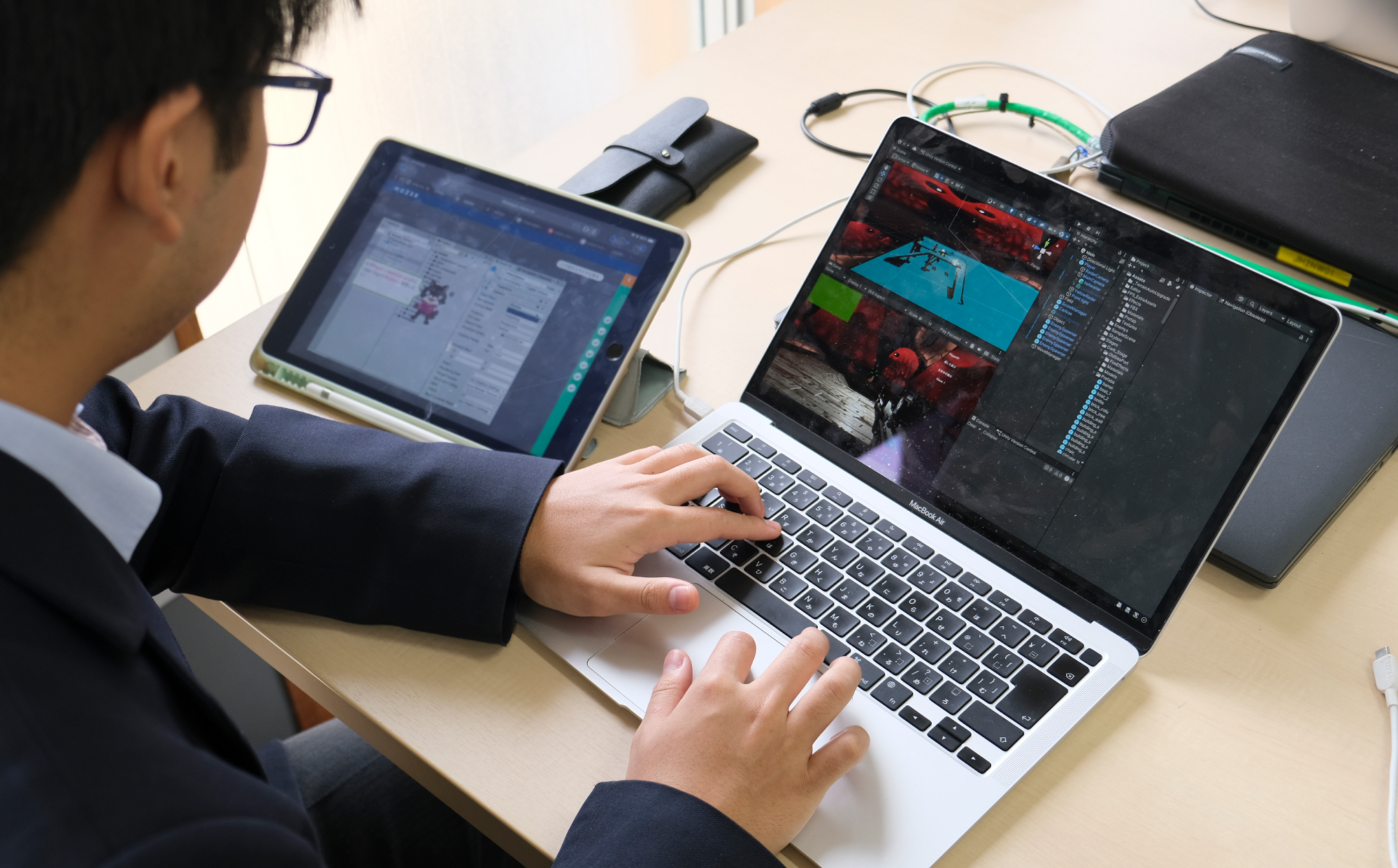iPadとMacの1人2台体制になり、生徒自身が場面に応じてそれぞれのデバイスの特性を活かした使い分けをしています。例えば、Macで制作作業をおこない、iPadでは教材や参考資料を表示したり、AIに壁打ちしたり。また、Macで参考動画を視聴しながら、iPadにApple Pencilでノートを取るなど、さまざまな活用をしている姿が見られます。