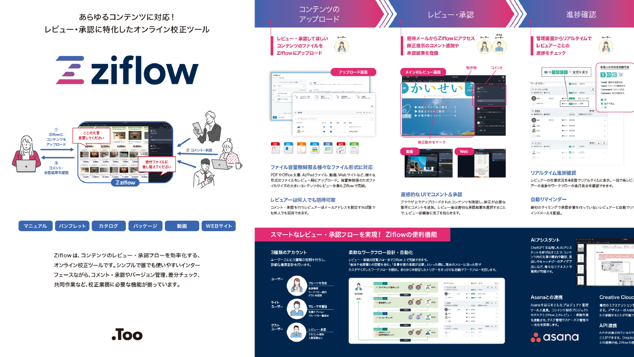 Ziflowはあらゆる制作物のレビュー・承認フローを効率化する、オンライン校正ツールです。シンプルで誰でも使いやすいインターフェースながら、バージョン管理や差分チェック、共同作業など、校正業務に必要な機能が揃っています。詳細なワークフローやフォルダの設計が可能なため、現状の業務フローのオンライン化・自動化をスムーズに実現します。