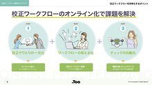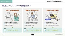 制作物の校正ワークフローをオンライン化、時短、コスト削減、ミスを防ぐことのできるソリューションのご提案資料です。校正に関する課題共有やオンライン校正ツール「Ziflow」を使った具体的なワークフロー例、導入事例をご紹介しています。(全32P)