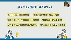 Ziflowはあらゆる制作物のレビュー・承認フローを効率化する、オンライン校正ツールです。シンプルで誰でも使いやすいインターフェースながら、バージョン管理や差分チェック、共同作業など、校正業務に必要な機能が揃っています。詳細なワークフローやフォルダの設計が可能なため、現状の業務フローのオンライン化・自動化をスムーズに実現します。