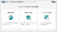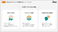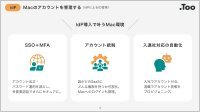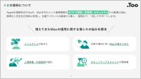Apple正規販売店のTooが、Macを中心とした業務環境をデバイス管理・ID管理・セキュリティから最適に設計。標準化と安全性を同時に実現し、各種ライセンスの調達から導入、 運用まで、一括してサポートします。この資料では、Mac運用の3つの軸の詳細をご確認いただけます。