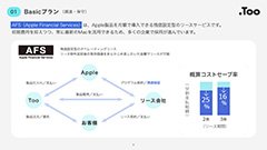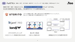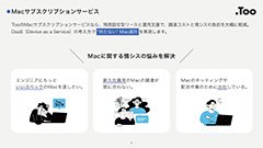 TooのMacサブスクリプションサービスなら、残価設定型リースと運用支援で、調達コストと情シスの負担を大幅に軽減。DaaS(Device as a Service)の考え方で“持たない”Mac運用を実現します。本資料では各プランの詳細をご確認いただけます。