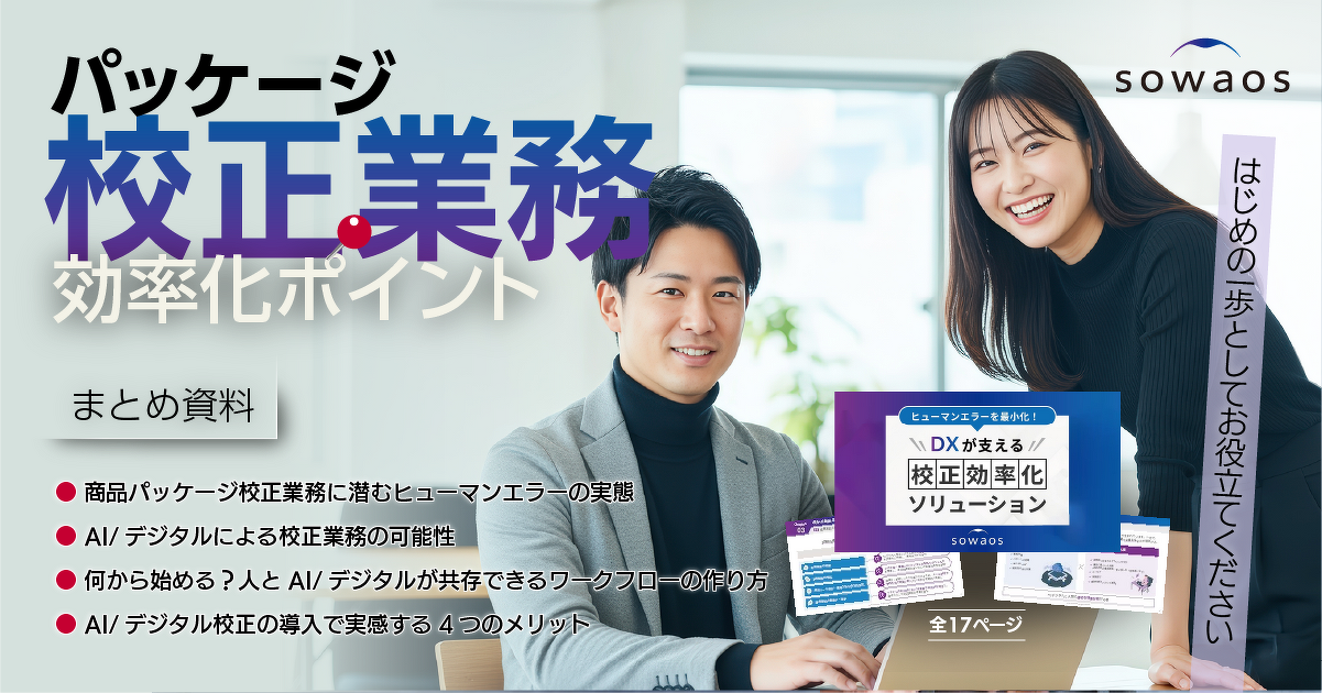 パッケージ校正業務に取り組まれており、AI/デジタルを活用した課題解決を検討されている方におすすめの資料です。AI/デジタルをパッケージ校正業務に取り入れるためにまず何から取り組めば良いか、はじめの一歩としてお役立ていただけます。
