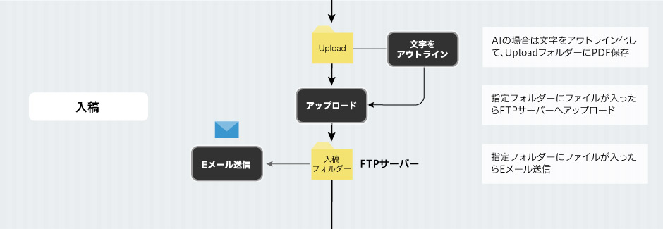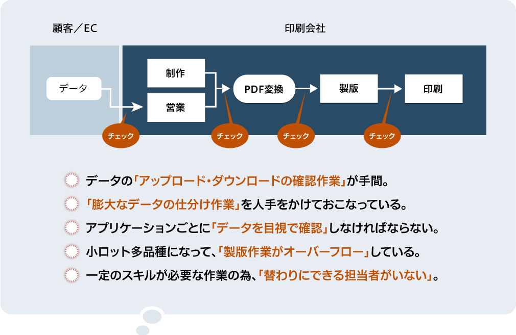 印刷ワークフローの課題の一つに入稿されたデータが印刷に適合していないことが挙げられます。また顧客やECから入稿されたデータを次のプロセスにまわす際にも人の手が必要です。