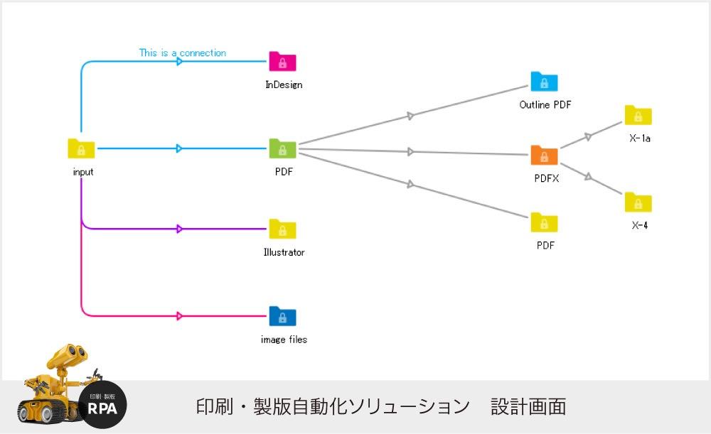 人間がファイルを仕分けする場合、アイコンや拡張子で判断しますが、Switchがファイルを仕分けする場合、ファイル内部のさまざまな属性情報を見てルールに則った仕分けをおこないます。例えば、PDFの内部にあるPDF/X-1aまたはPDF/X-4の情報をもとにファイルを開くことなく自動的に仕分けできます。この他、作成したアプリケーションやバージョン、ドキュメントのカラースペース、仕上がりサイズ、ページ数などなど、さまざまな内部情報を条件として仕分けします。これによって、ファイルの流れる方向をコントロールします。