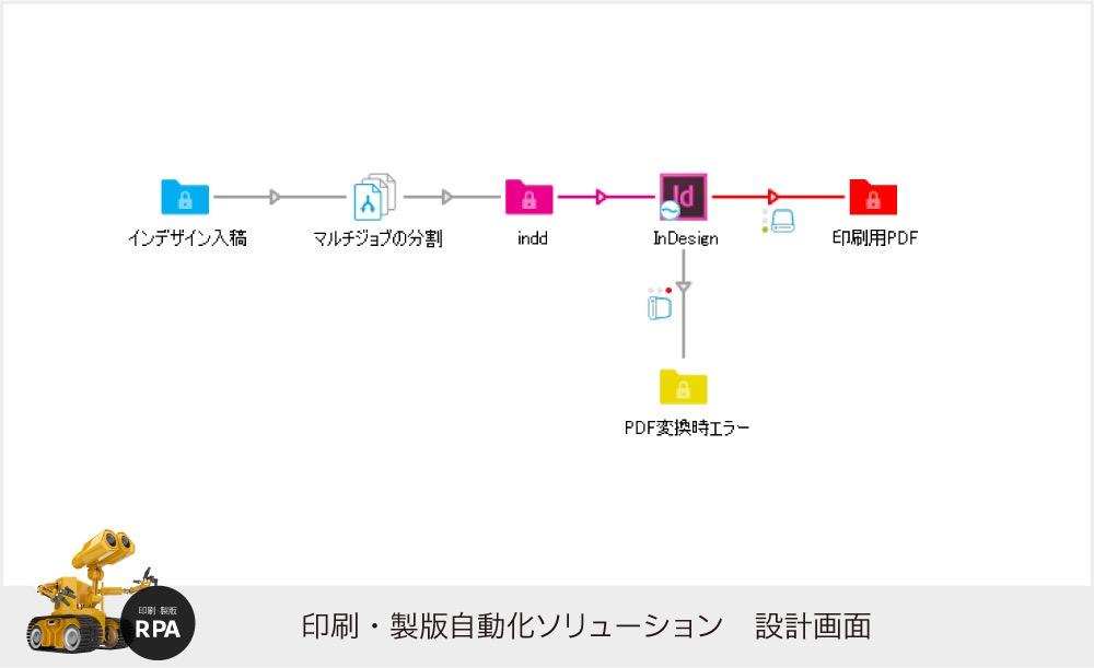 所定のフォルダーへInDesignファイルを入れると、InDesignのプリフライト機能を実行して自動的にPDFに変換します。その後、入稿ファイル名および入稿日の追加などの自動処理を経て、最終的に印刷または製版工程へ印刷用PDFを出力します。お客様が作成したJavaScriptを自動実行する事も可能ですのでご相談ください。また、インデザインファイルと同様にイラストレーターファイルの印刷用PDF変換を自動化することも可能です。
