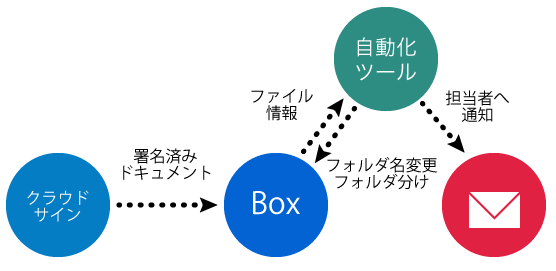 Box上にクライアントごとのフォルダを作成し、ルールに従ったファイル名に変更して格納。担当者へメールで通知します。
