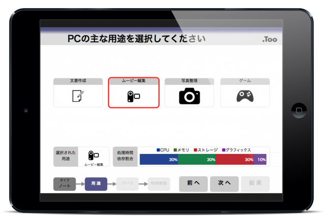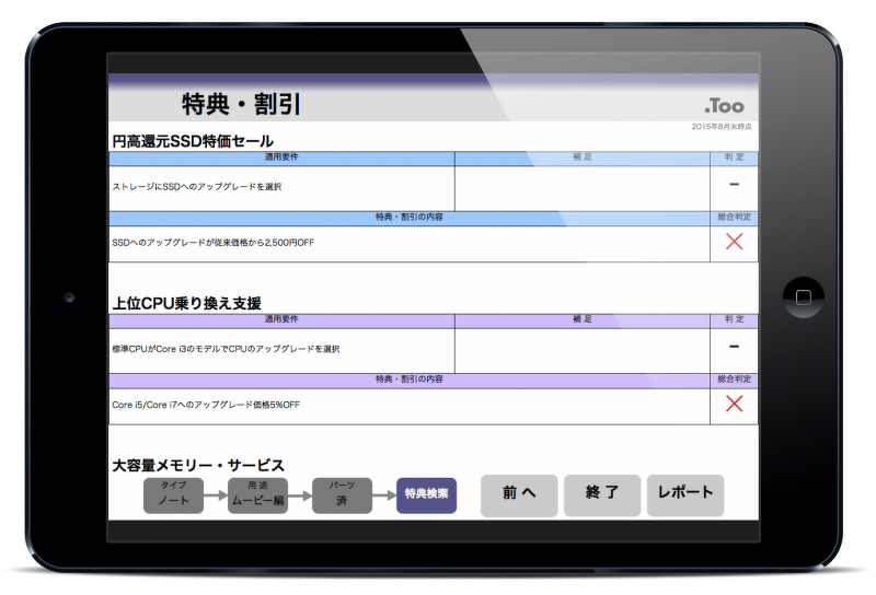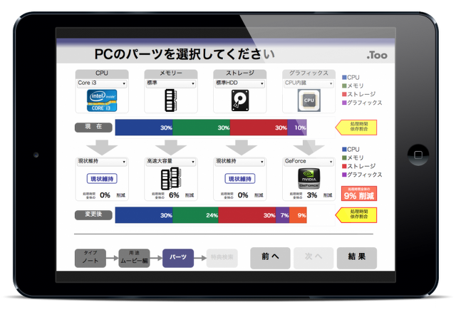 パソコンの買い替えシミュレーションをするツールです。 現在使用している内容と、変更後の内容を選択すると、どれくらい性能が変わるかグラフで表示されます。 ボタンタッチで直感的に操作が出来、店頭でお客様自身で操作頂けます。 またシミュレーション結果により特典情報や割引情報を表示し、その場でメール送信することも可能です。