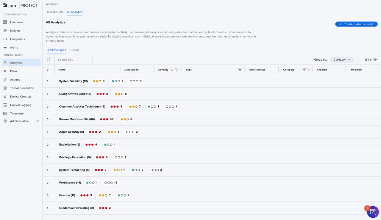 MITRE ATT&CKのナレッジにもとづいてmacOS上で発生する不審なユーザの挙動や悪意のあるふるまいを検出します。検出したAnalyticsに対して、Jamf Proと連携し、設定されたポリシーに沿って復旧処理を自動的におこなうことも可能です。