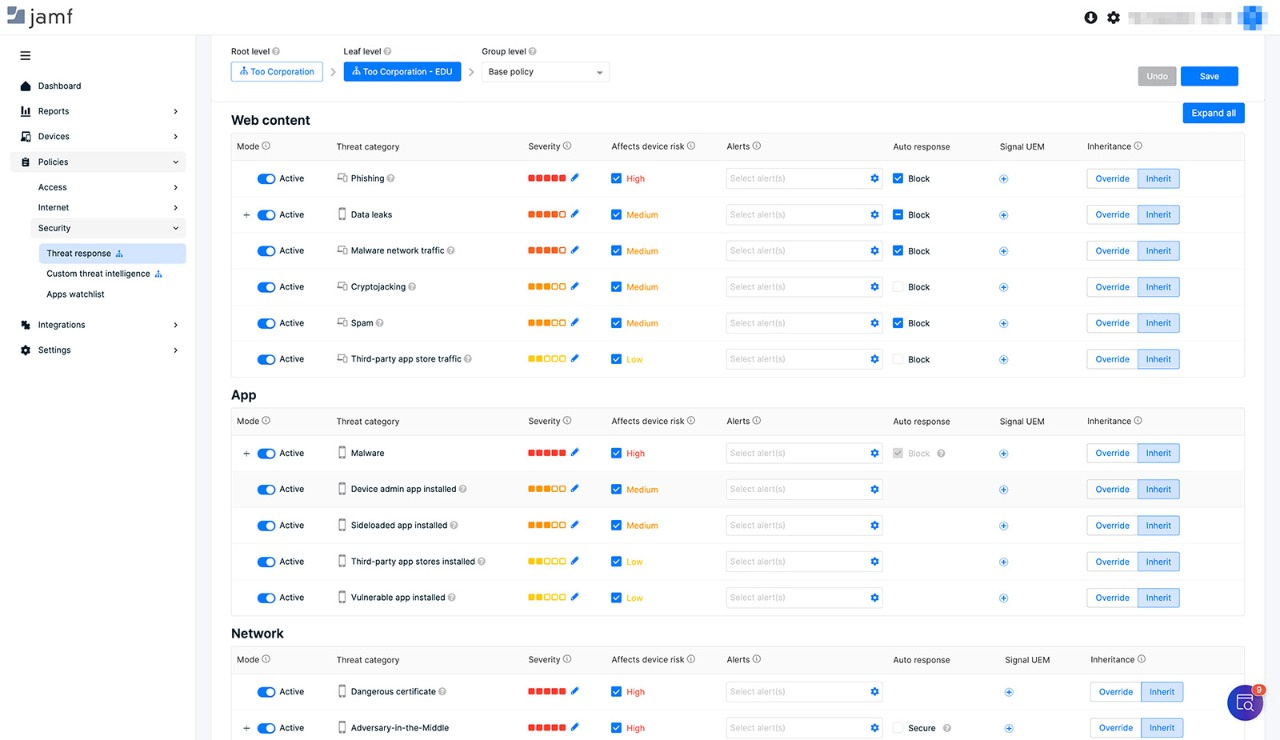 危険な状態のデバイスがあれば、業務アプリケーションへのアクセスを制限する「条件付きアクセス」のために必要なリスクレベルの提供をおこないます。 他のJamf製品やクラウドアイデンティティプロバイダとの統合によりアクセスを制御します。