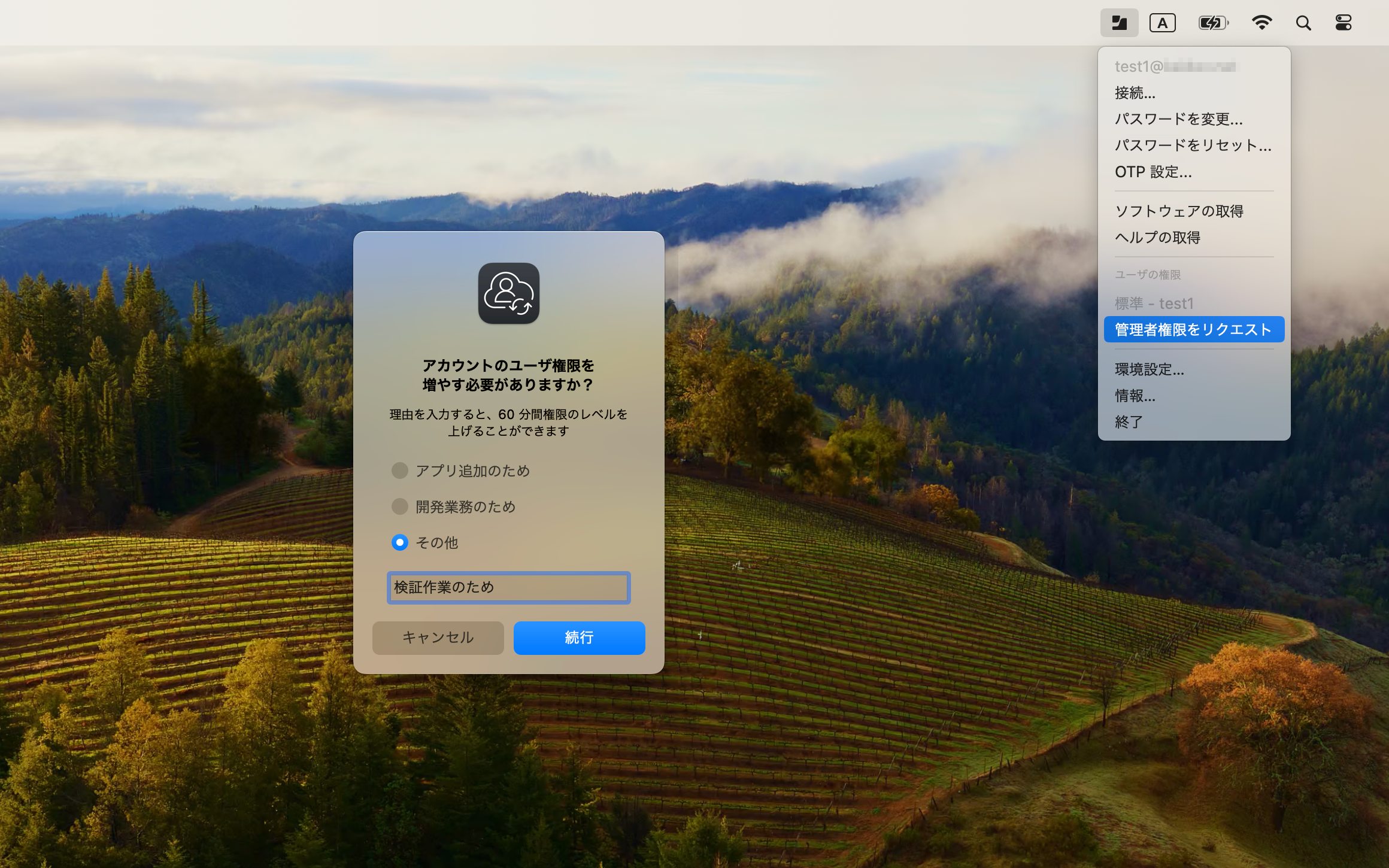 メニューバーAppから標準ユーザをローカル管理者に一時的に昇格させることができます。昇格を許可する期間や回数、昇格できるユーザグループを限定することも可能です。権限昇格に関するログについては、SIEM製品と統合することで管理・解析することができます。
